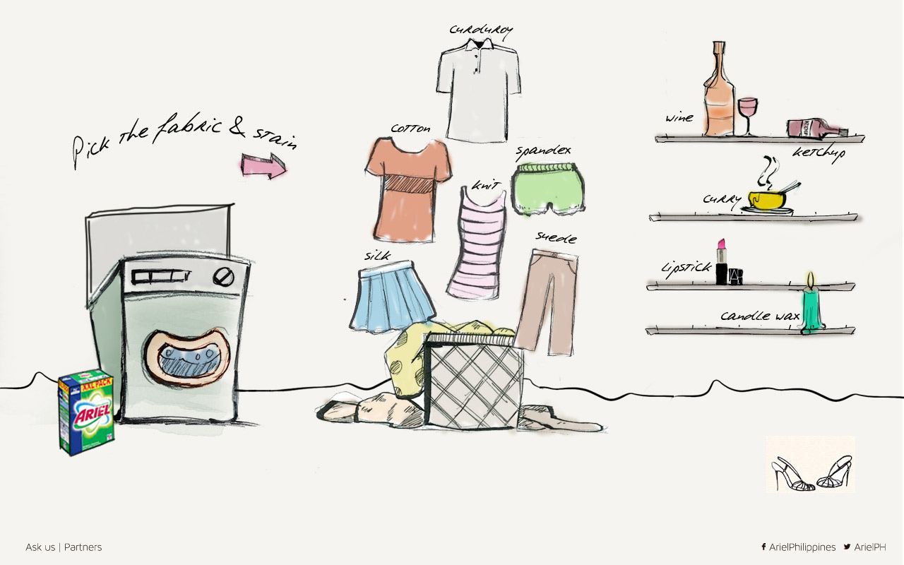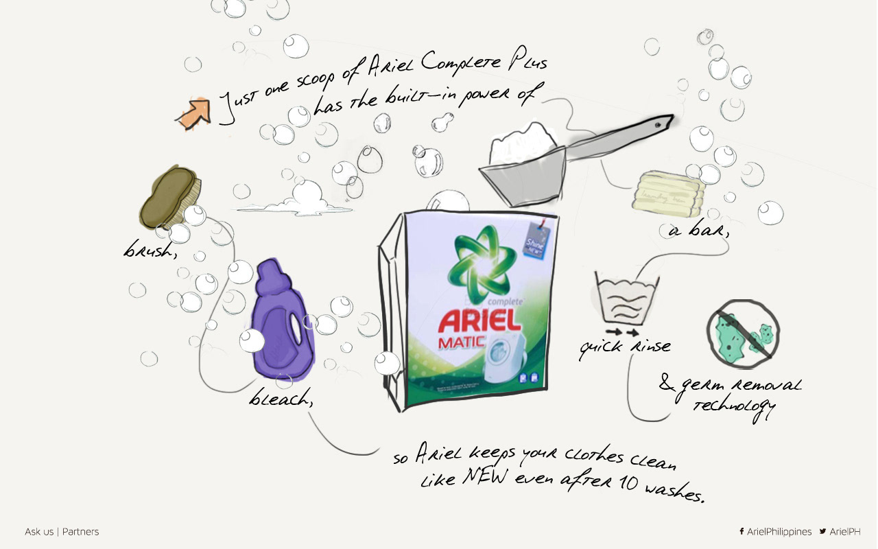 This proposed website redesign for Ariel, one of the Philippines’ leading laundry detergent brands, reimagined the digital experience with a fresh sketch-and-handwritten aesthetic. The goal was to humanise the brand and make stain-solving feel more intuitive, personal, and emotionally relatable to everyday Filipino households.