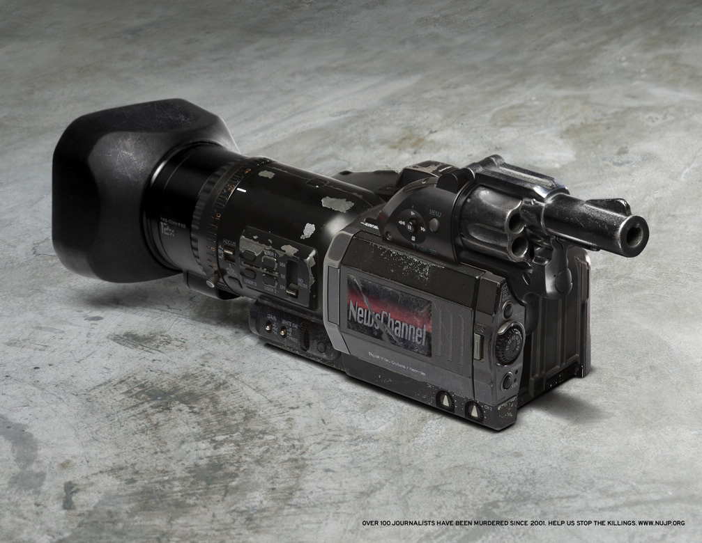 With a striking visual pun: a video camera seamlessly merged with the pistol muzzle of a gun, symbolising how tools of truth have become targets, and how simply reporting the news can cost journalists their lives.