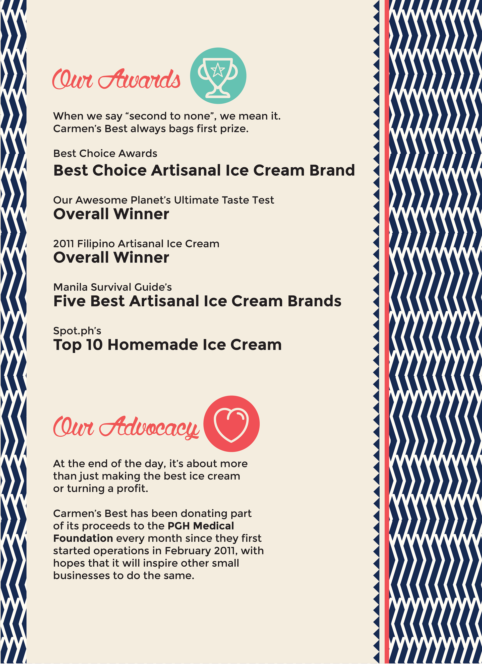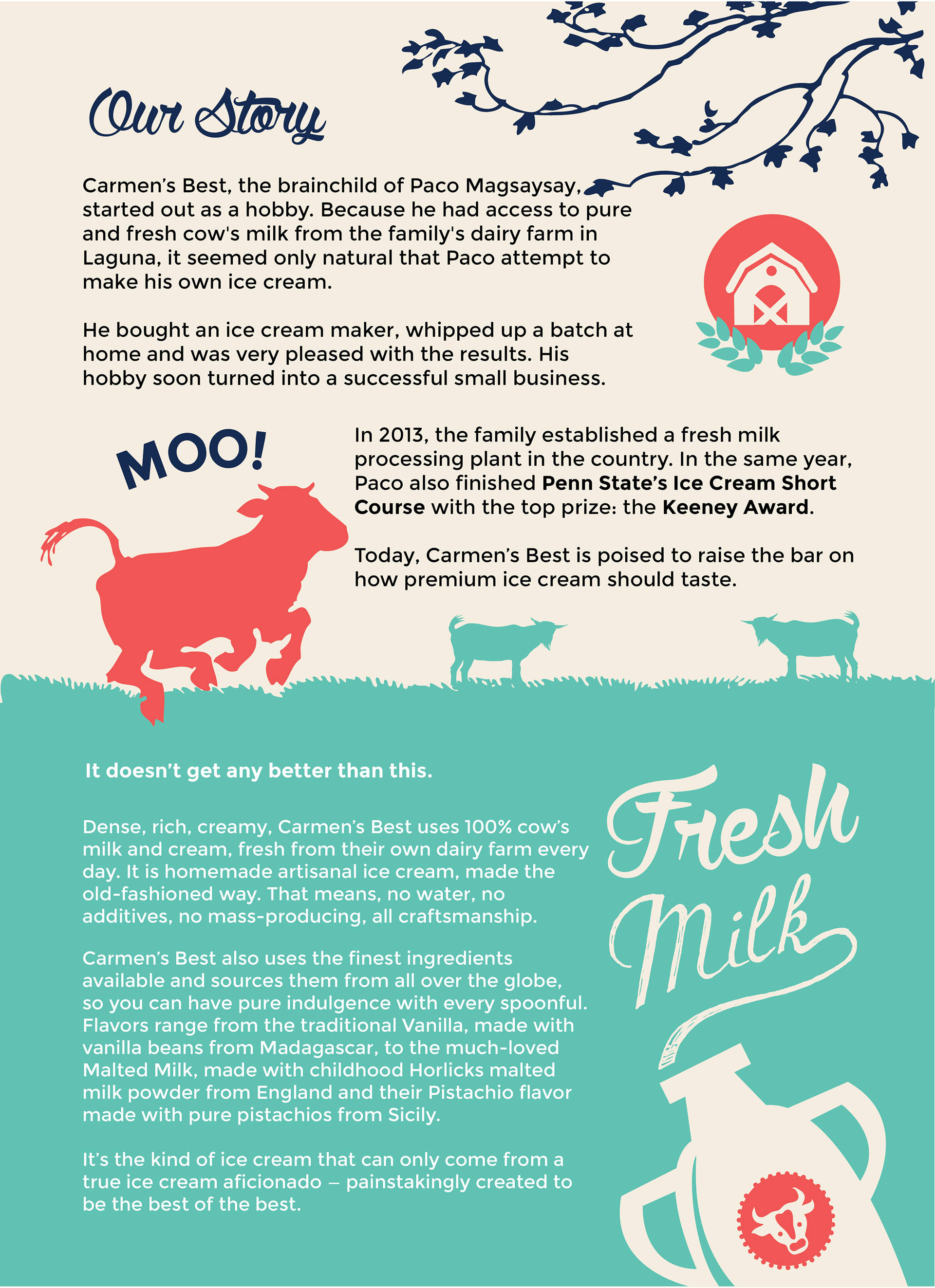 Developed a PR sales kit for Carmen’s Best, a premium Filipino ice cream brand known for its rich dairy base and high-quality ingredients. Unlike traditional sales materials that skew corporate or serious, this kit embraced the playful personality of the brand through clean, modern vector illustrations and light, friendly visuals—reflecting the simple joy of great ice cream.