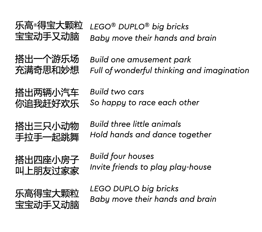 Designed for parents of babies and toddlers, this campaign highlights the proven developmental benefits of LEGO DUPLO through a research-informed lens. Early-childhood studies show that hands-on, open-ended play strengthens fine-motor skills, spatial awareness, early numeracy and literacy foundations, as well as cognitive abilities such as sequencing, cause-and-effect understanding, and problem-solving. Drawing on these insights, we crafted a narrative that demonstrates how DUPLO play supports key developmental milestones—from grasping and stacking to imaginative role-play that builds social and emotional intelligence.
