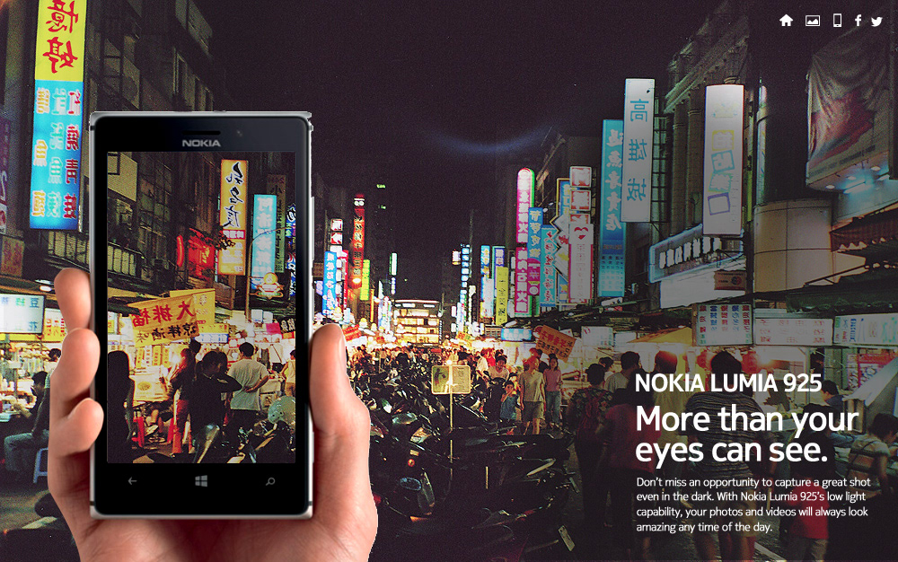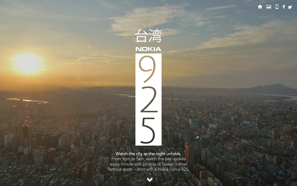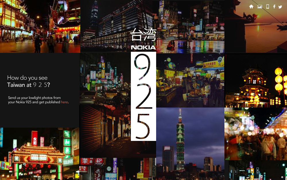 For the launch of the Nokia 925 in Taiwan, we developed a concept website that spotlighted the phone’s standout feature: its exceptional low-light camera performance. The design embraced a sleek, time-based aesthetic—reflecting the amount of light throughout the day with deep tones, subtle gradients, and light-driven accents—to mirror the clarity and detail the 925 could capture.